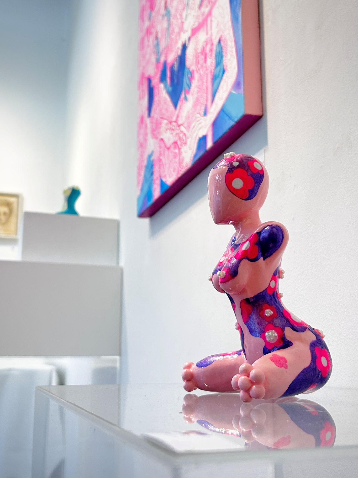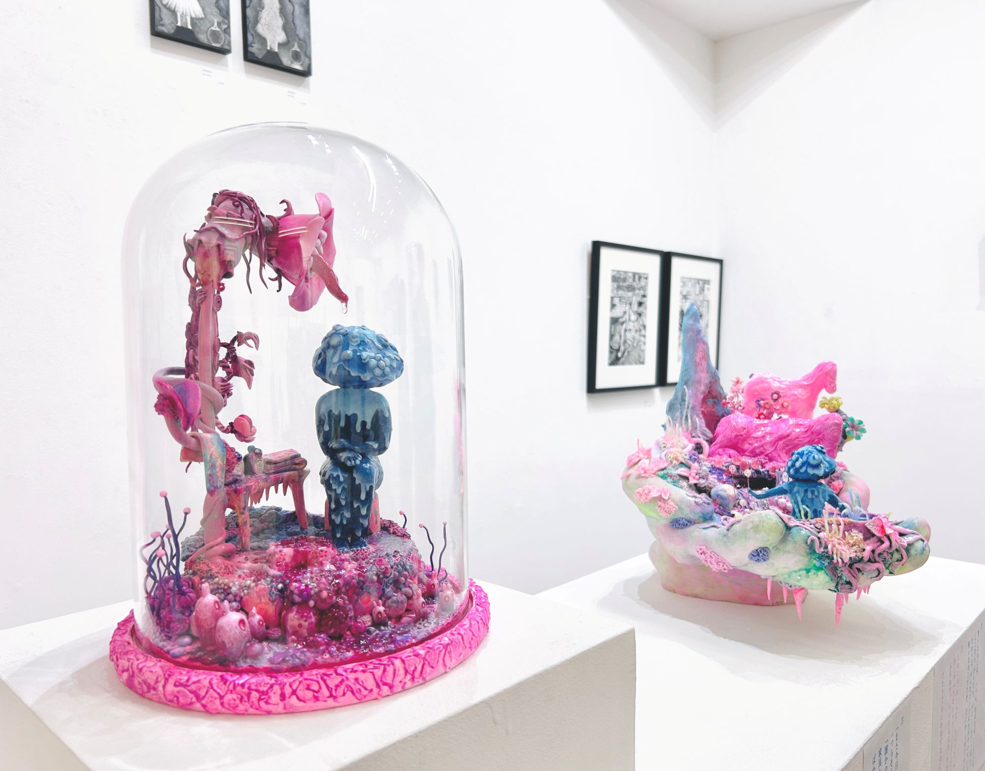 「若き期待の女性アーティスト水村芙季子は大作《狂乱演舞》などのカラードローイングで知られるが、独特のオブジェ作品もまた異彩を放っている。いずれの作においても、クリーミーに、ときにエロティックに溶解-崩壊してゆく幻景がスローな変容を繰り返して、見る者を眩暈に巻き込もうとするだろう。しかるに、彼女の美幻魔術に翻弄されるわれわれは、一方で、変容の過程で惹起してはまたふたたび消えゆく快美の幻影に恍惚となるのである」2025年10月 相馬俊樹(美術評論)
